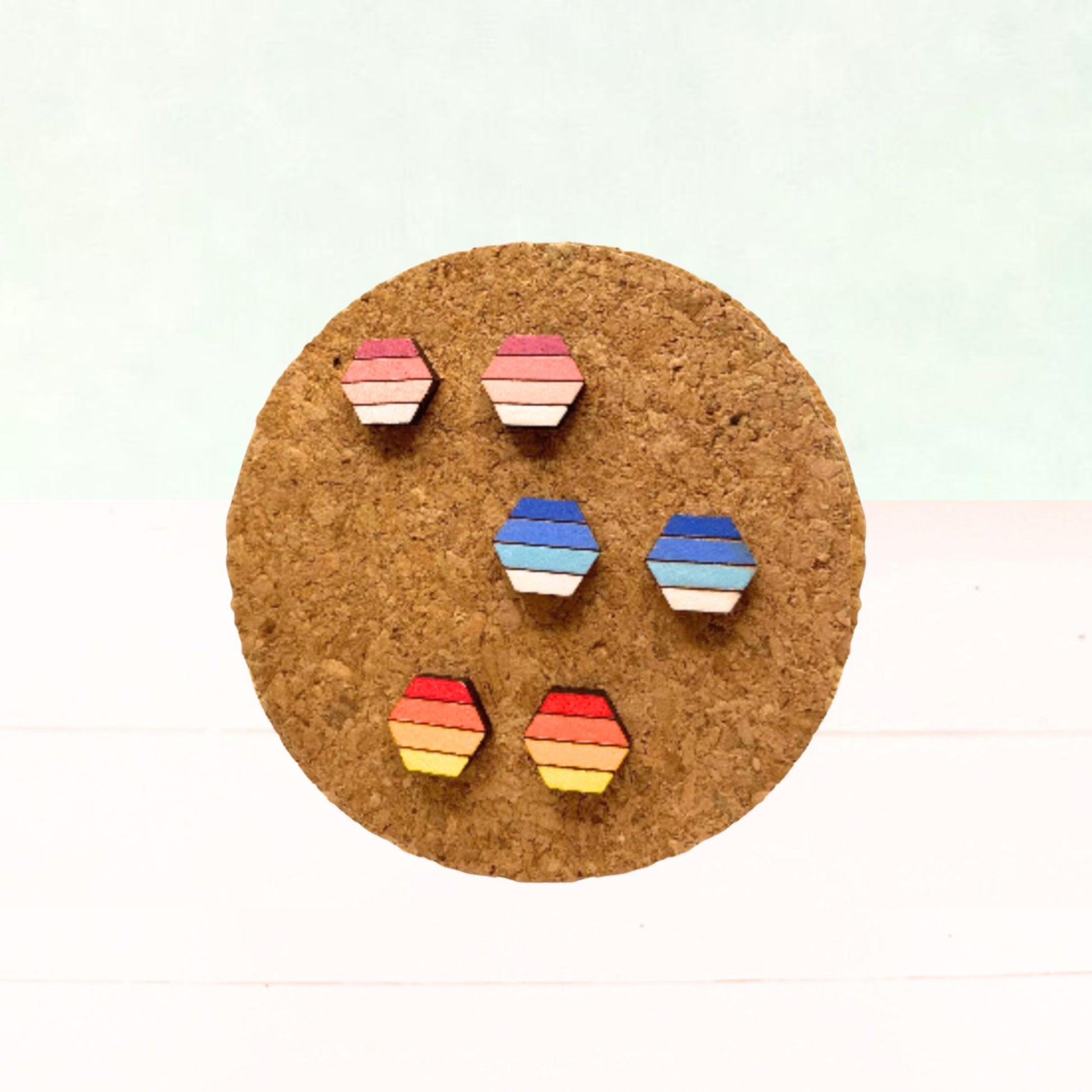 These geometric studs will be a hit when you wear them out around town. These wooden earrings are cut from maple and then hand painted. The ombre affect with the stripes will add interest and great colors to any outfit.Grab a set for yourself and another for a friend!